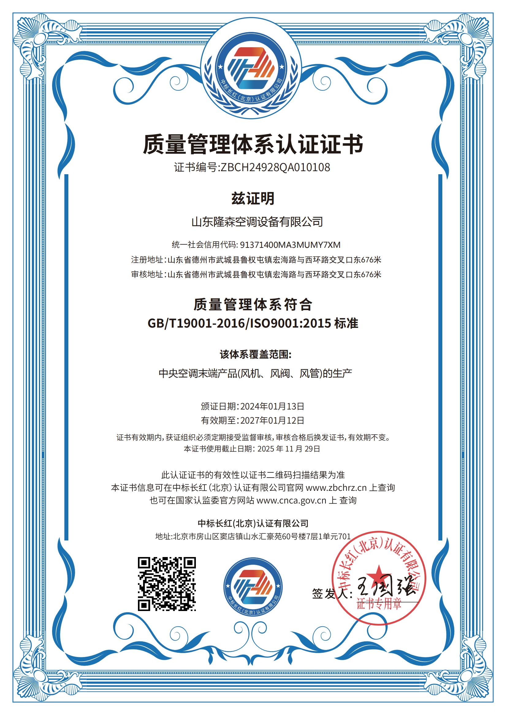 山東隆森空調設備有限公司座落于素有“九達天衢、神京門戶”美譽之稱的美麗德州,注冊資金1000萬,公司成立于2002年前身為山東明通通風空調設備加工廠。從事中央空調系統設備、通風設備、防排煙設備、玻璃鋼產品的制造、銷售、安裝及研發(fā)于一體的現代化企業。山東瀧森空調設備有限公司生產的產品主要有:排煙風機、消防排煙風機、離心風機、 新風換氣機、新風機組、凈化空調機組、醫用空調組合機組、螺桿機組、風冷機組、醫用凈化空調機組、吊頂式機組、轉輪式新風換氣機機組、風機盤管、排煙風機箱、混流風機、排煙防火閥......